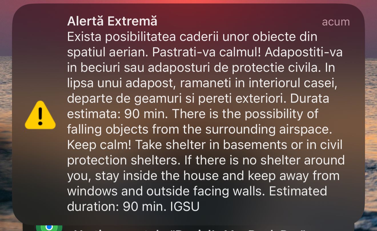 Duminică seara, în jurul orei 22:40, Inspectoratul General pentru Situații de Urgență a transmis un mesaj RO-ALERT prin care informa populația din zona de Nord a județului Tulcea despre posibilitatea căderii unor obiecte din spațiul aerian, în zona de graniță a României cu Ucraina.