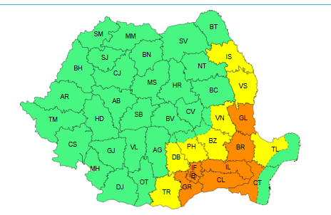 Potrivit ANM, în județele Giurgiu, Călărași, Ialomița, Brăila, Galați, Ilfov și municipiul București, precum și în zona continentală a județului Constanța valul de căldură se va menține intens, va fi caniculă, disconfort termic accentuat, iar indicele temperatură-umezeală (ITU) va depăși pragul critic de 80 de unități. Temperaturile maxime se vor încadra între 36 și 39 de grade.