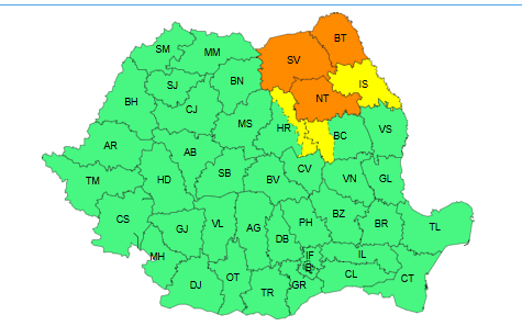 Conform ANM, în nordul Moldovei și local în zona Carpaților Orientali, vor fi perioade cu instabilitate atmosferică ce se va manifesta prin averse torențiale, descărcări electrice, grindină de mici dimensiuni (1…2 cm), intensificări ale vântului și vijelii (rafale în general de 50…70 km/h). În intervale scurte de timp sau prin acumulare, cantitățile de apă vor fi de 20…25 l/mp, iar pe arii restrânse de peste 30…40 l/mp.