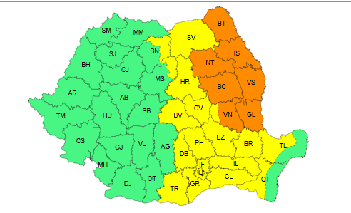 Conform ANM, în nordul Moldovei și local în zona Carpaților Orientali, vor fi perioade cu instabilitate atmosferică ce se va manifesta prin averse torențiale, descărcări electrice, grindină de mici dimensiuni (1…2 cm), intensificări ale vântului și vijelii (rafale în general de 50…70 km/h). În intervale scurte de timp sau prin acumulare, cantitățile de apă vor fi de 20…25 l/mp, iar pe arii restrânse de peste 30…40 l/mp.