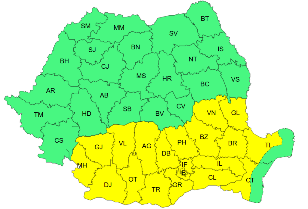 Totodată, ANM a mai emis un cod galben și pentru miercuri, 03 septembrie, valabil în Oltenia, în Muntenia, în sudul Moldovei și în Dobrogea continentală, cu temperaturi deosebit de ridicate, local caniculă și disconfort termic, iar indicele temperatură-umezeală (ITU) va atinge local pragul critic de 80 de unități.
