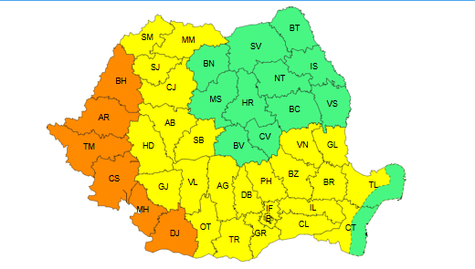 De asemenea, meteorologii au emis un cod portocaliu de caniculă și disconfort termic accentuat, noapte tropicală în perioada 10 august, ora 10.00 – 11 august, ora 10.00 în județele Bihor, Arad, Timiș, Caraș-Severin, Mehedinți și Dolj.