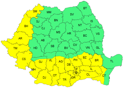 Meteorologii din cadrul Administrației Naționale de Meteorologie au emis un cod galben de caniculă și disconfort termic ridicat, noapte tropicală în perioada 9 august, ora 12.00 – 10 august, ora 10.00 în Banat, Crișana, Oltenia, Muntenia și sud-vestul Dobrogei.