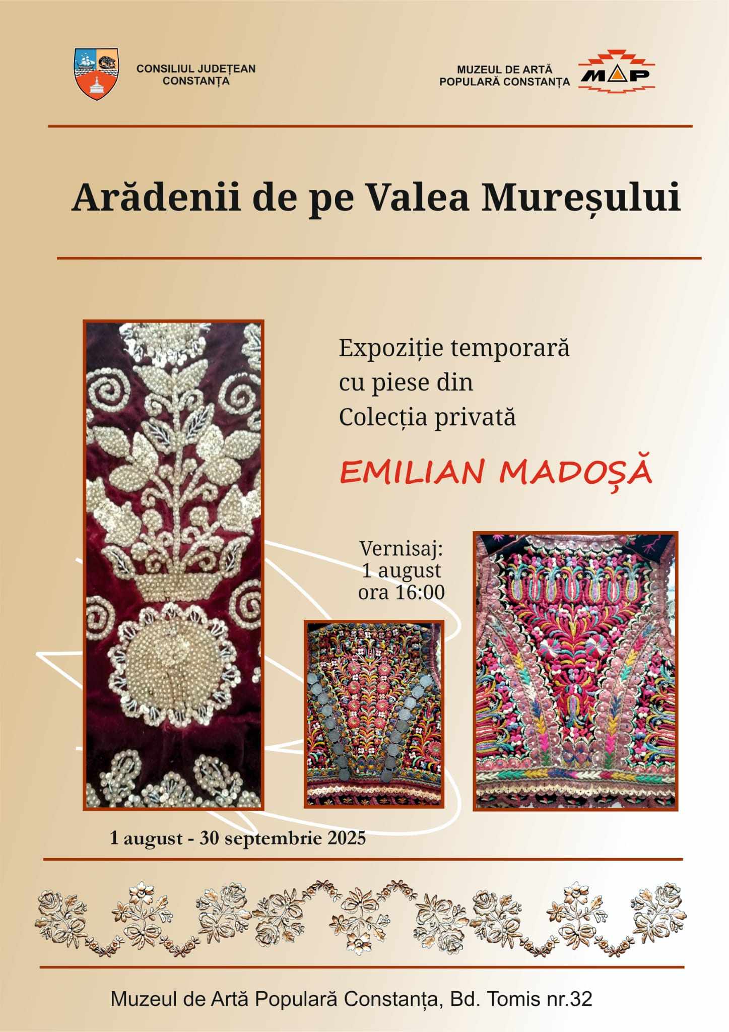 Muzeul de Artă Populară Constanța, instituție finanțată de Consiliul Județean Constanța, organizează în perioada 1 august – 30 septembrie expoziția „Arădenii de pe Valea Mureșului”, realizată cu piese din Colecția privată Emilian Madoșă.