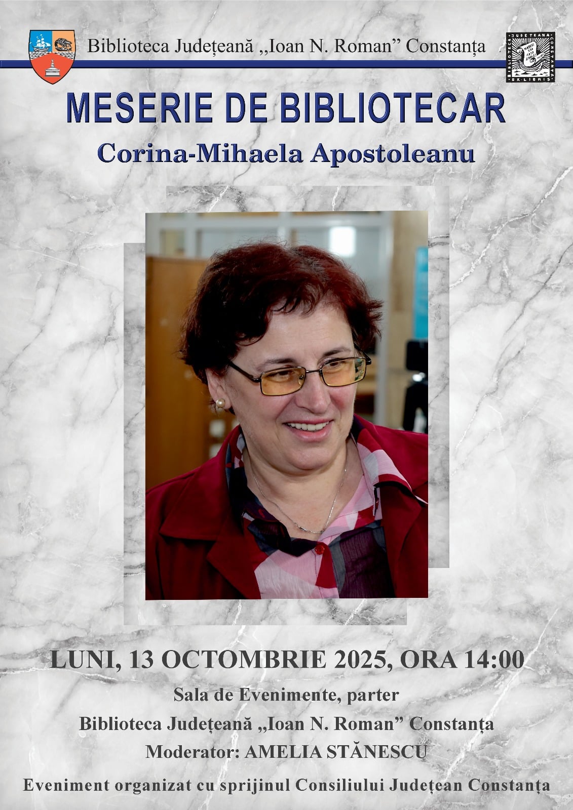 Luni, 13 octombrie 2025, ora 14.00, Biblioteca Județeană „Ioan N. Roman” Constanța vă invită la prima ediție din seria MESERIE DE BIBLIOTECAR – un proiect care își propune să prezinte publicului larg și, în special, tinerilor, portrete ale bibliotecarilor pentru care această meserie încununează un destin de succes.