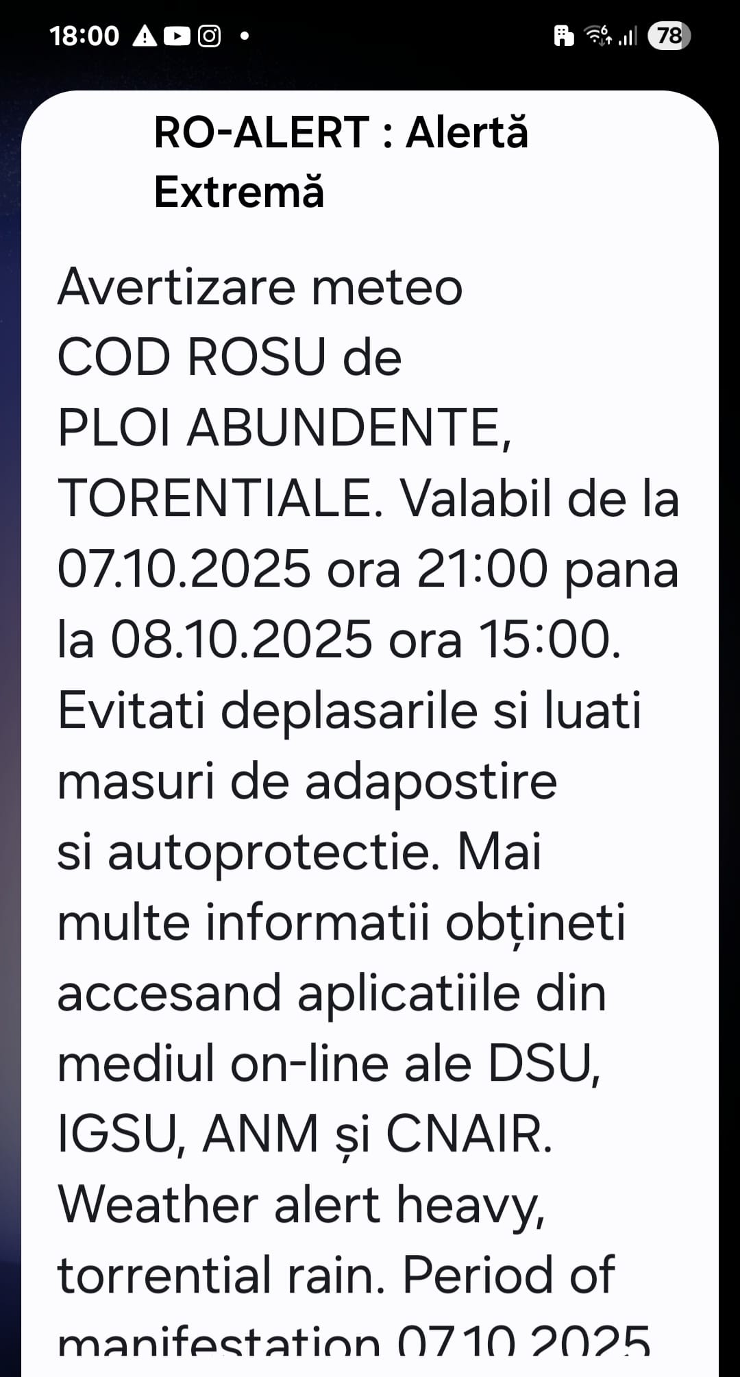 În intervalul 7 octombrie, ora 21:00 – 8 octombrie, ora 15:00, se vor semnala ploi torențiale și abundente, în județele Constanța, Călărași, Ialomița, Giurgiu, Ilfov și în municipiul București, va ploua torențial și abundent, izolat se vor semnala descărcări electrice, iar în intervale scurte de timp sau prin acumulare vor fi cantități de apă de 80…100 și izolat 120…140 l/mp.