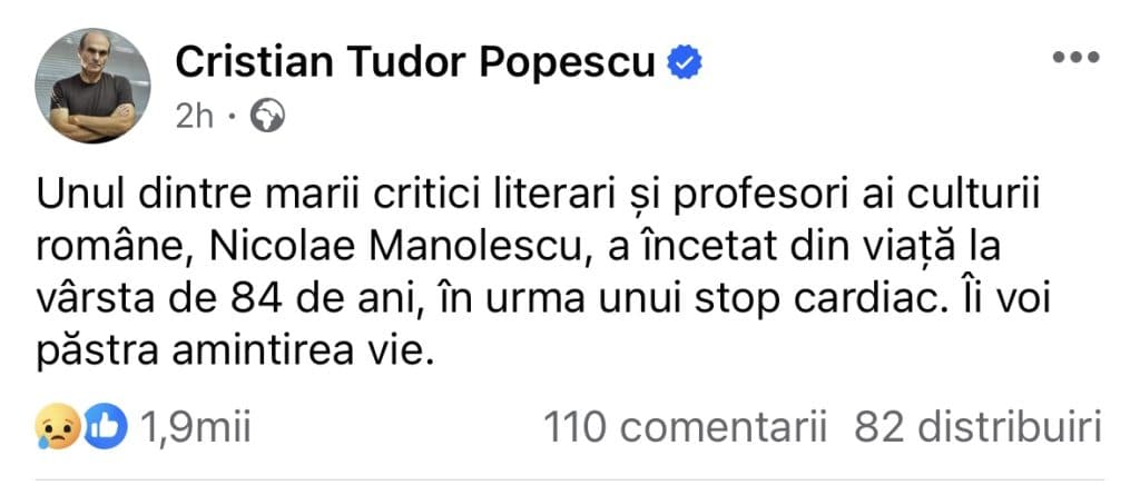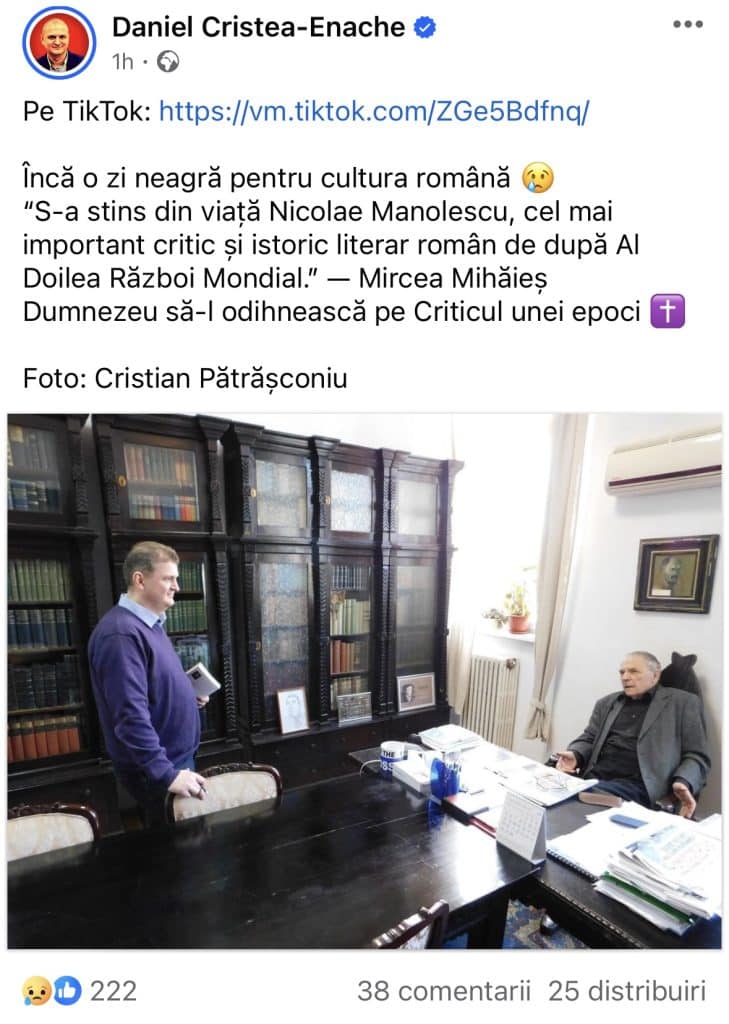 De asemenea, criticul literar Daniel Cristea-Enache deplânge moartea profesorului Nicolae Manolescu.