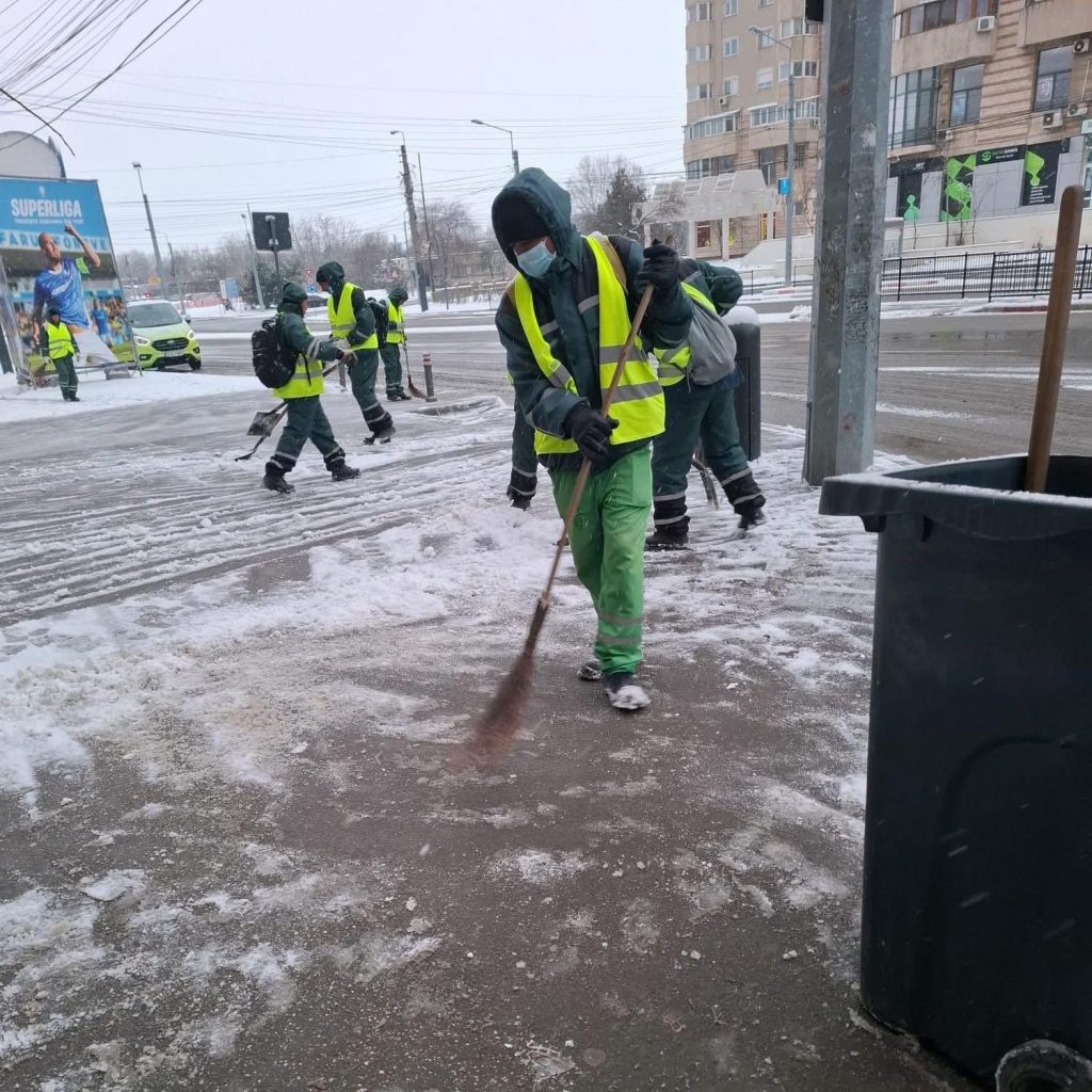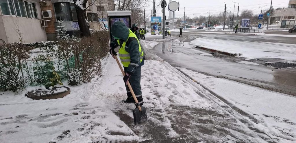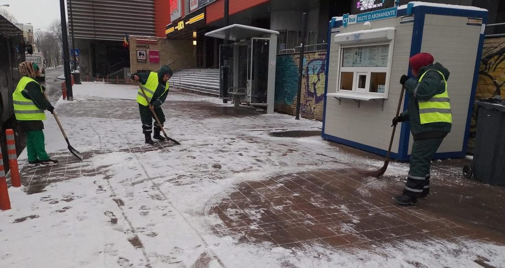 Angajații societății de salubrizare continuă și la această oră să degajeze zăpada din stațiile de autobuz, trecerile de pietoni, trotuarele, pasajele și scările de acces către acestea.