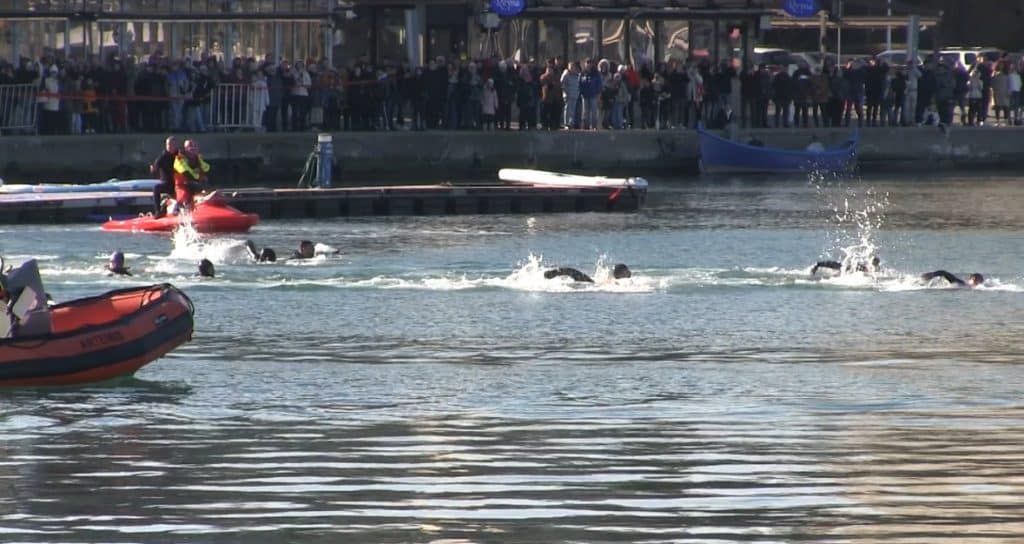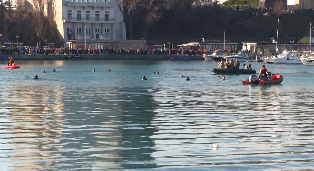 Mai mulți bărbați s-au aruncat în apă pentru a recupera cele trei cruci.