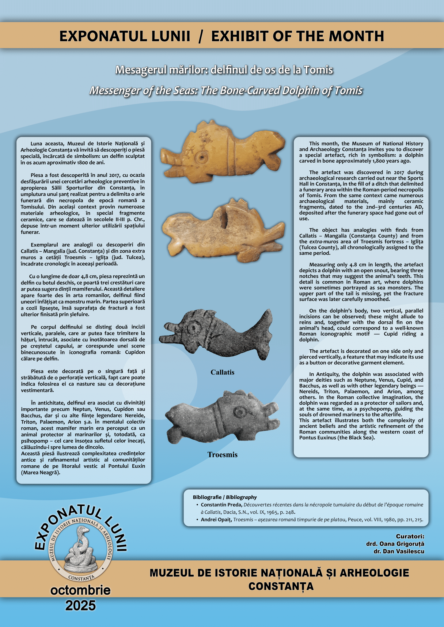 Luna aceasta, Muzeul de Istorie Națională și Arheologie Constanța vă invită să descoperiți o piesă specială, încărcată de simbolism: un delfin sculptat în os acum aproximativ 1800 de ani.