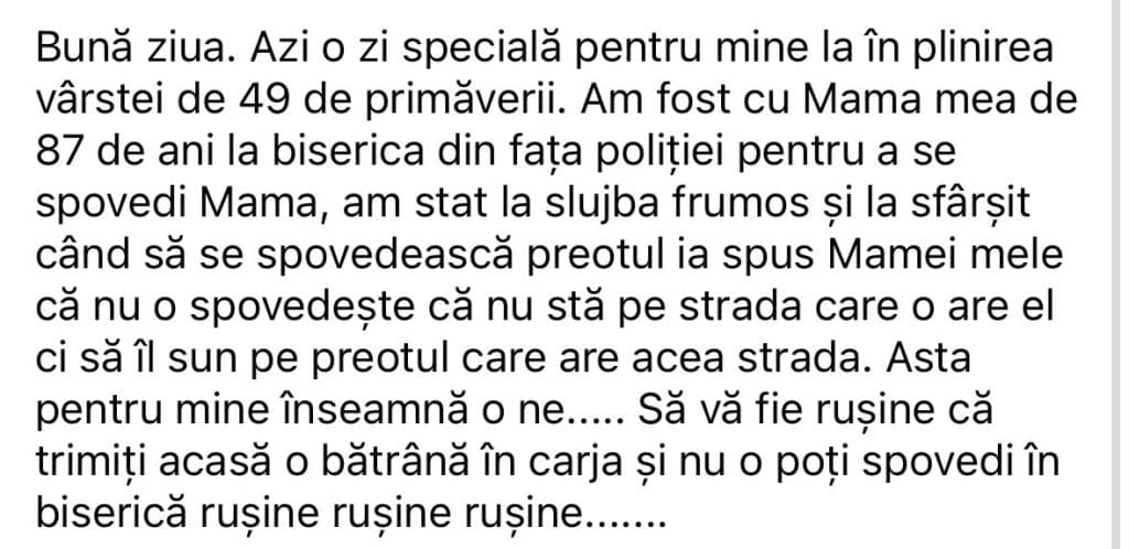 Întâmplarea a fost relatată de fiul bătrânei. Acesta a povestit totul pe un grup de Facebook din Valu lui Traian. El a adăugat că preotului ar trebui să-i fie rușine pentru că a refuzat-o pe mama lui, care era în cârje.