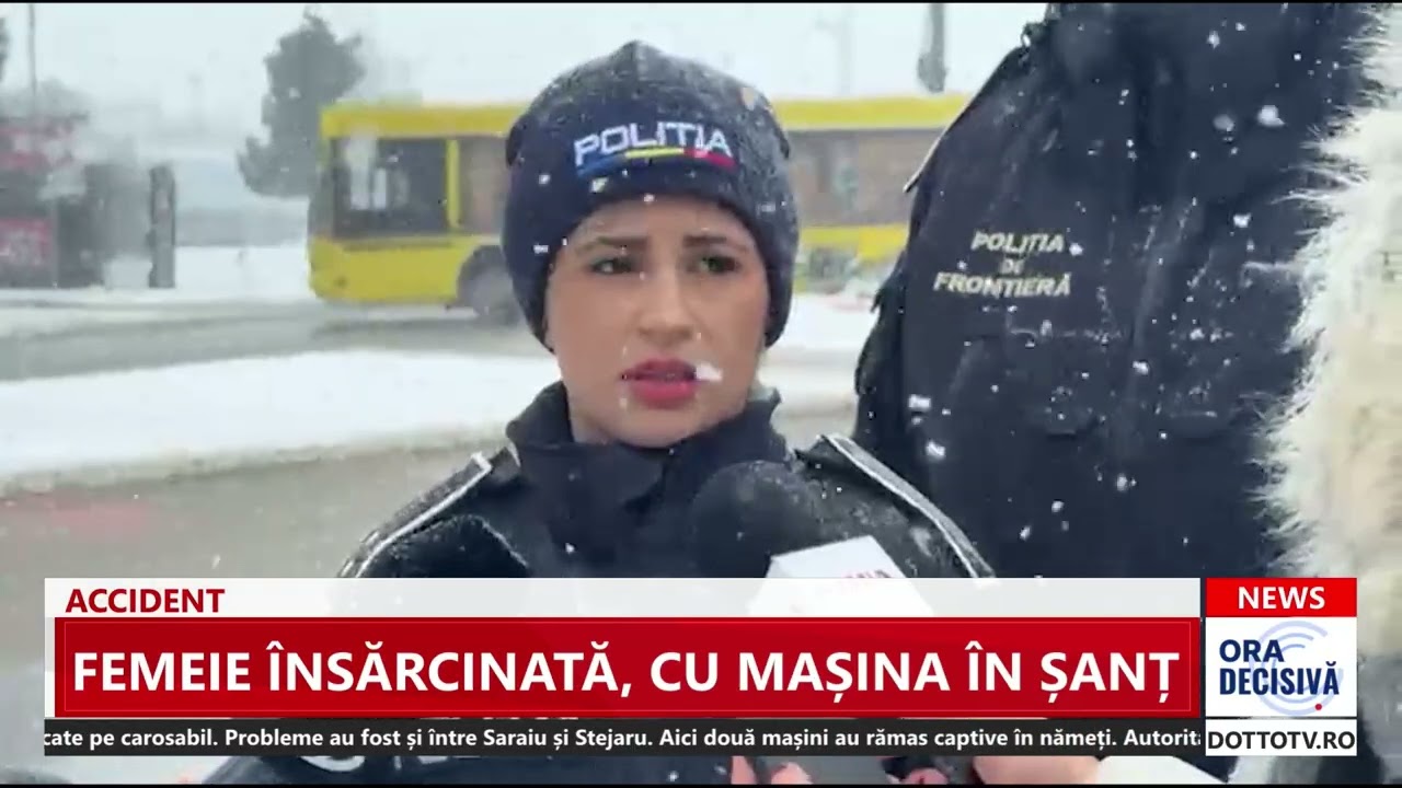 Pe DN22, în zona Mihai Viteazu, o femeie însărcinată în opt luni a ajuns cu mașina în șanț, după ce a pierdut controlul volanului pe carosabilul alunecos.