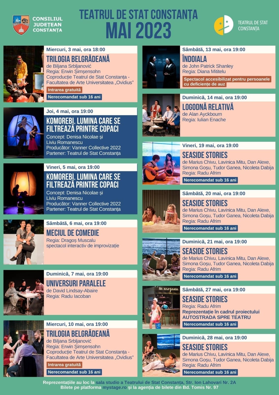 Teatrul de Stat Constanța și-a publicat programul din luna mai, care va fi, de fapt, ultima lună din stagiunea teatrală 2022 – 2023. În continuare, lunile iulie și august vor veni cu stagiunea estivală, SEAS 2023, care va fi cel puțin la fel de bogată în spectacole ca cea de anul trecut.
