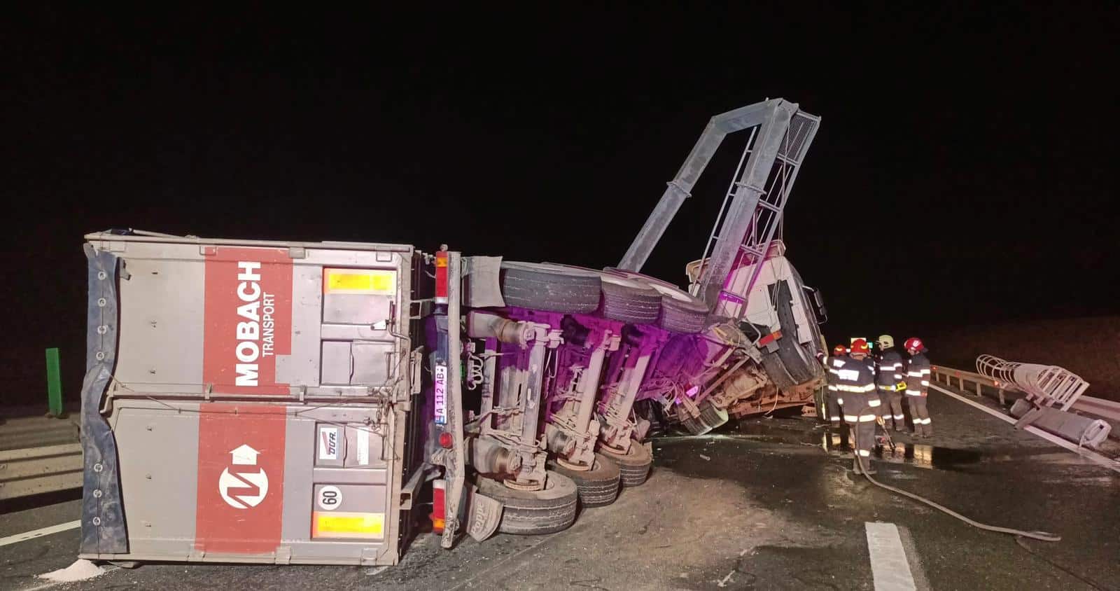 Un autocamion s-a răsturnat pe carosabil după ce a intrat într-un panou electric de informare, pe care l-a rupt. Incidentul a avut loc noapte trecută, în dreptul localității Murfatlar.