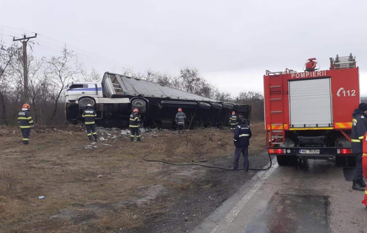 Un camion s-a răsturnat pe DN2A între localitățile Stupina și Crucea.