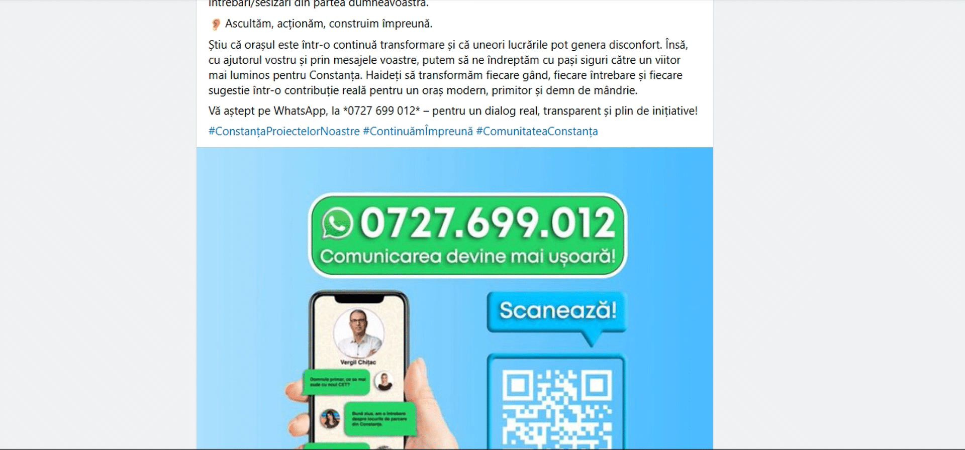 Activ, dar nu prea… Noul canal de comunicare, lansat ieri de primarul Vergil Chițac se dovedește a fi… doar o iluzie. Vergil Chițac a anunțat pe pagina lui de Facebook că pentru a comunica mai bine și mai rapid cu toți constănțenii pune la dispoziția acestora un număr de WhatsApp.