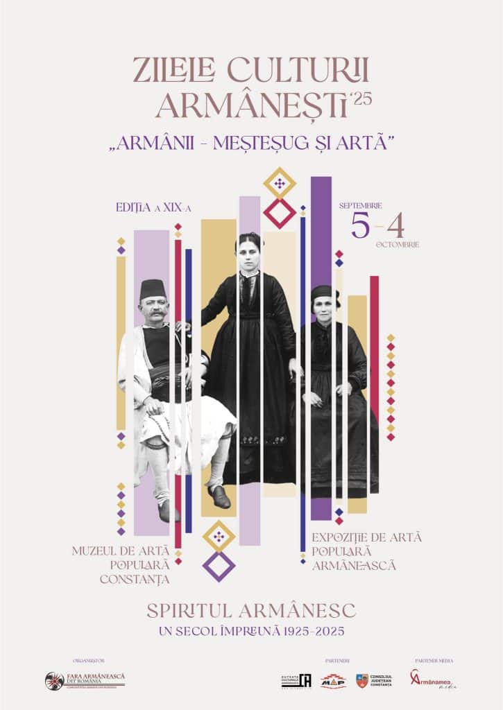 Asociația Comunitatea Armână din România organizează în Constanța, în perioada 5 septembrie – 4 octombrie 2025, ediția a XIX-a a evenimentului „Zilele Culturii Armâneşti”, ce va include o serie de activităţi care își propun să-și aducă aportul la o mai bună vizibilitate a patrimoniului cultural al comunităţii noastre. De altfel, întreg evenimentul va constitui un bun prilej pentru a ne bucura de şansa oferită astăzi în Europa tuturor culturilor, mai mari sau mai mici.