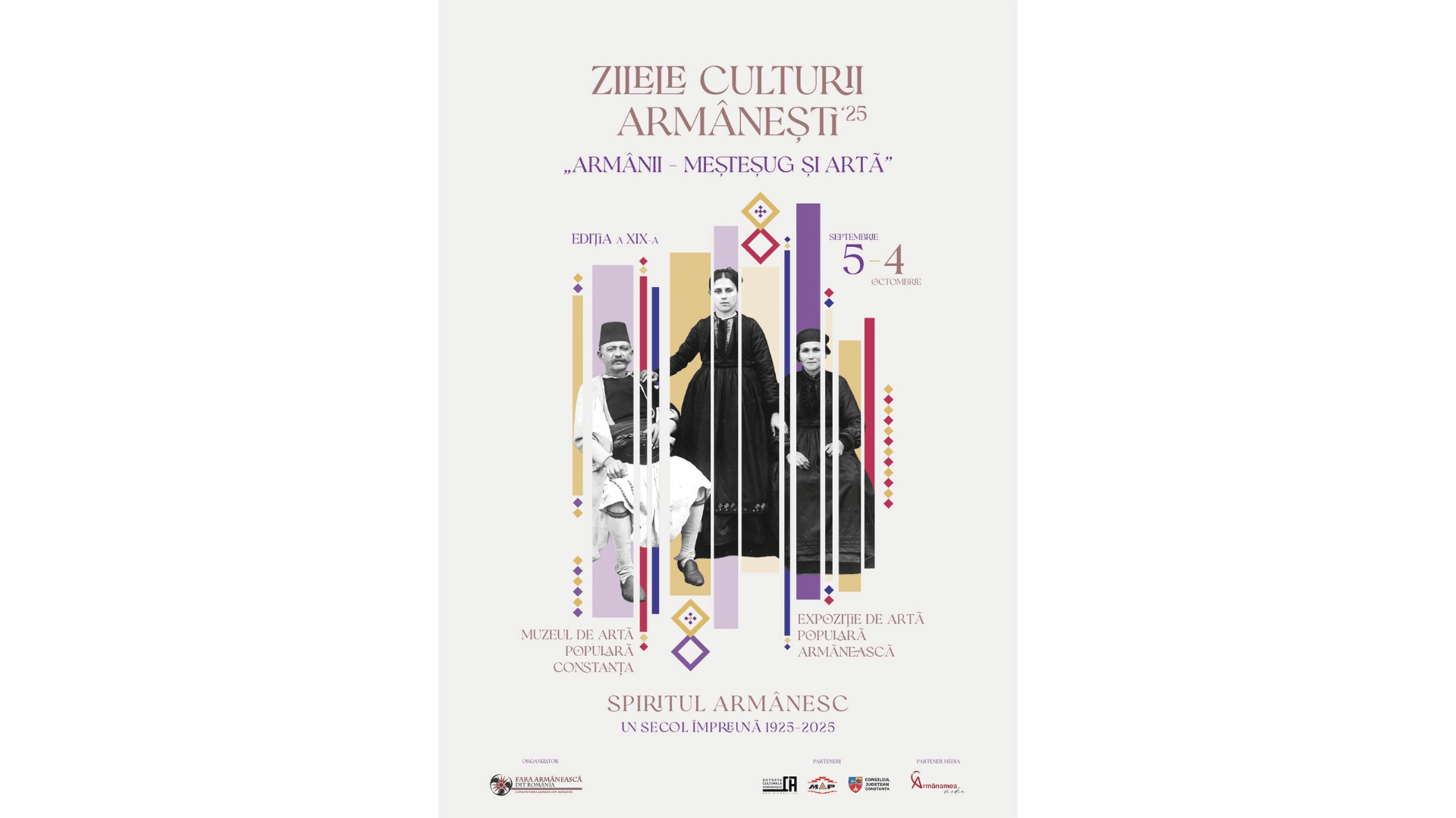 Asociația Comunitatea Armână din România organizează în Constanța, în perioada 5 septembrie – 4 octombrie 2025, ediția a XIX-a a evenimentului „Zilele Culturii Armâneşti”, ce va include o serie de activităţi care își propun să-și aducă aportul la o mai bună vizibilitate a patrimoniului cultural al comunităţii noastre. De altfel, întreg evenimentul va constitui un bun prilej pentru a ne bucura de şansa oferită astăzi în Europa tuturor culturilor, mai mari sau mai mici.