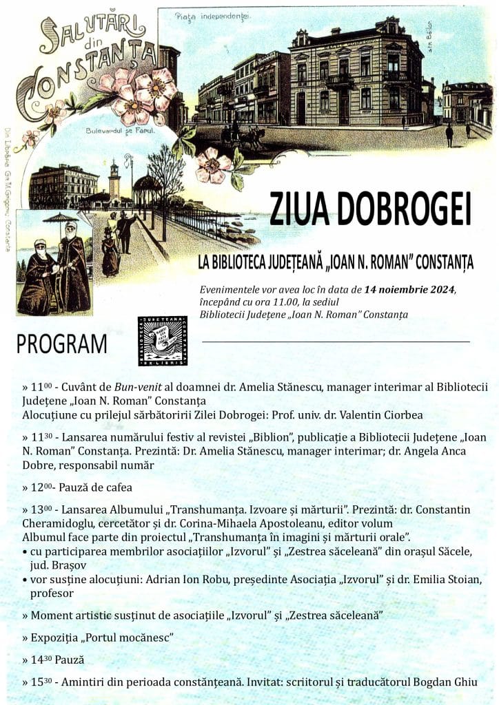 Ziua Dobrogei, 14 noiembrie 2024, este sărbătorită la Biblioteca Județeană „Ioan N. Roman” din Constanța prin următoarele evenimente: