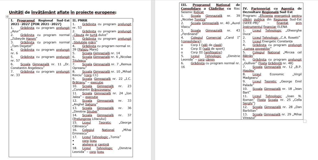 Până în prezent, 17 unități de învățământ au fost finalizate, beneficiind de lucrări de reabilitare și modernizare. În paralel, 44 de unități se află în diverse etape de implementare prin programe europene și naționale, inclusiv prin PNRR, Programul Regional Sud-Est 2021–2027 și Programul Național de Consolidare. Totodată, alte 5 unități sunt pregătite pentru a intra în proiecte de reabilitare și eficientizare energetică, asigurând continuitatea acestui demers investițional.