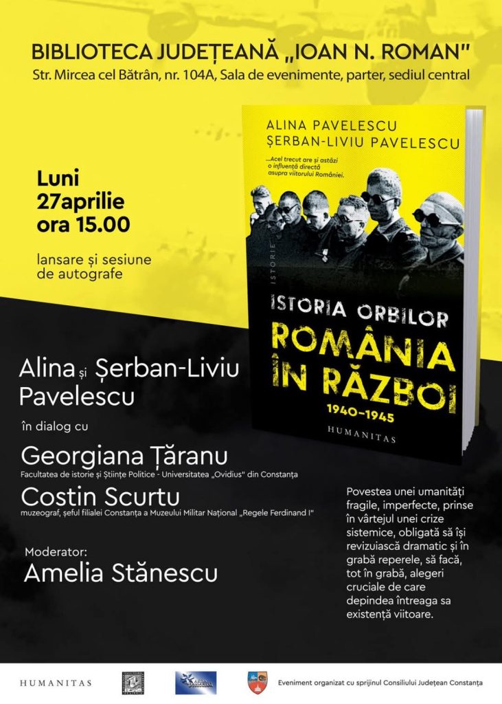 Biblioteca Județeană „Ioan N. Roman” Constanța găzduiește luni, 27 aprilie a.c., lansarea volumului „Istoria orbilor. România în război, 1940-1945″, semnat de istoricii Alina Pavelescu și Șerban-Liviu Pavelescu, publicat anul trecut de prestigioasa editură Humanitas.